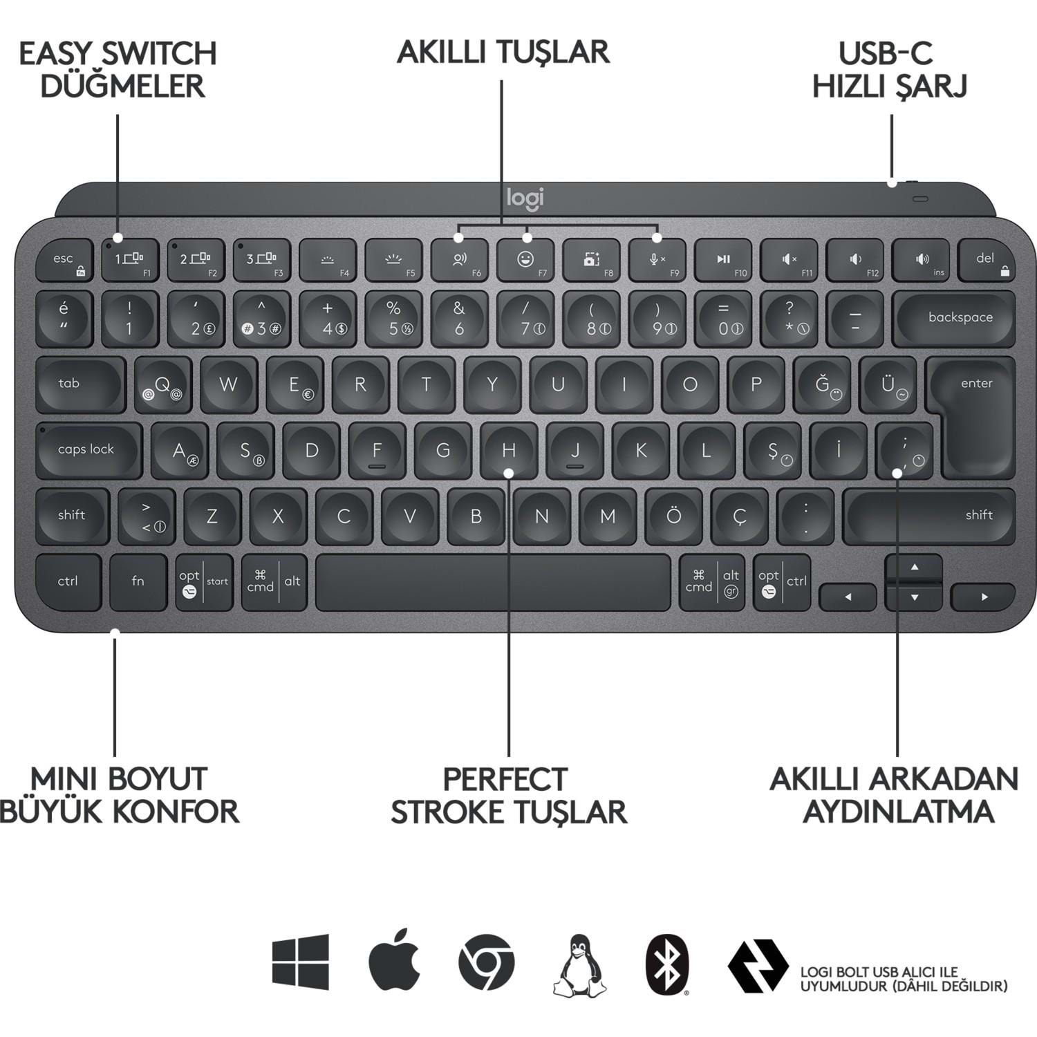 LOGITECH MX KEYS MINI MINIMALIST KABLOSUZ BLUETOOTH AYDINLATMALI Q TR KLAVYE SİYAH 920-010504