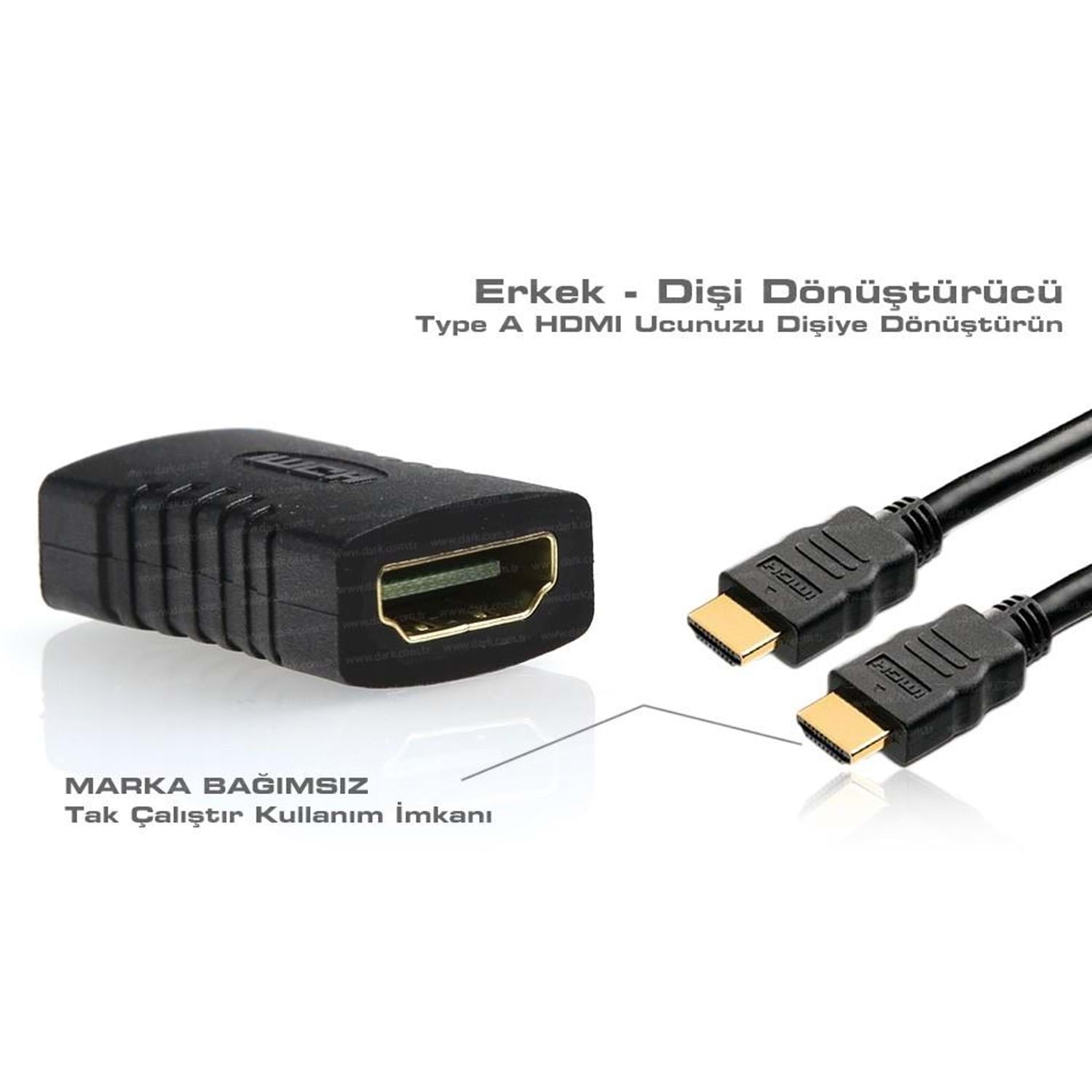 Dark HDMI dönüştürücü, HDMI A-Tip giriş ve çıkışa sahiptir. Tüm A-Tip HDMI kablolar ve bağlantılar ile %100 uyumludur.