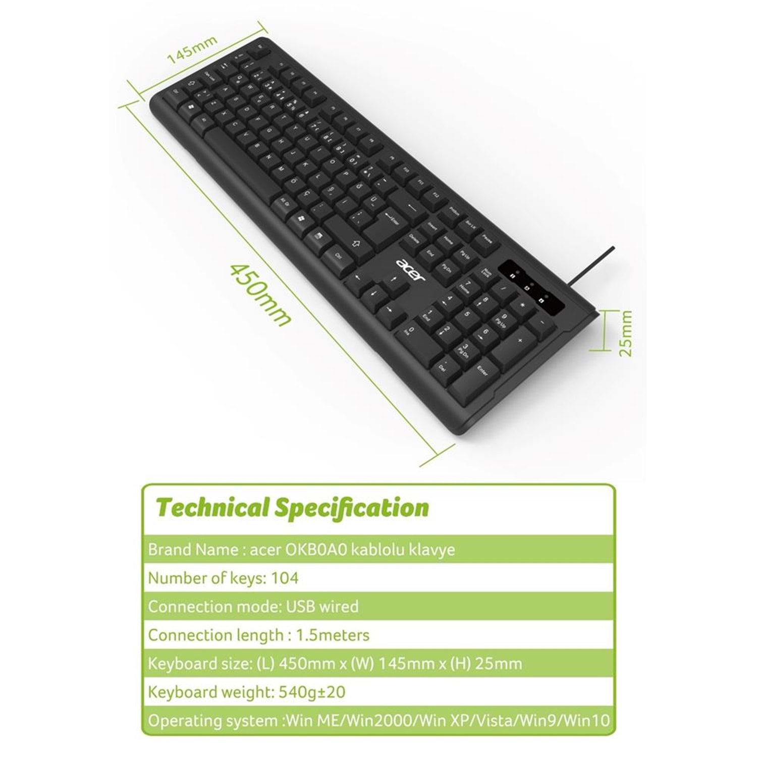 Acer OAK-0A0 Siyah Kablolu Sessiz Tuşlu Klavye (Caps Lock) (Kablo Uzunluğu 1.50Cm) Caps Lock
